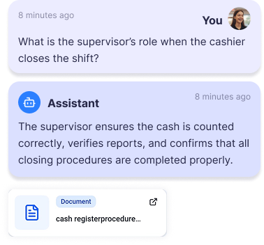 One source of truth, not five versions Policies, SOPs, and procedures live in one official place—no outdated docs, no personal interpretations.