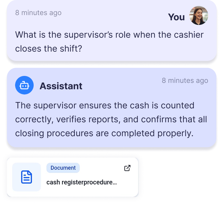Everyone. New hires use it to onboard faster, store employees use it to answer daily questions, and managers use analytics to identify gaps and keep training consistent.